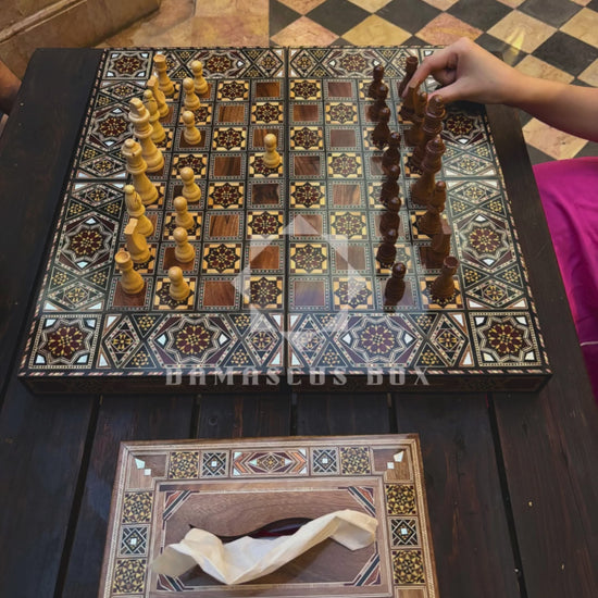 damaszener tisch, schach und backgammon, Gaby Al Dayeh, perlmutt, syrisches kunsthandwerk, orientalisches design, luxuriöses spielset, figuren und würfel enthalten, mosaikkunst