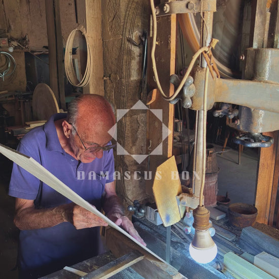 Dieser außergewöhnliche Tisch von Gaby Al Dayeh vereint Backgammon und Schach in einem kunstvollen Damaszener Meisterwerk. Mit über 75 Jahren Erfahrung perfektioniert der 90-jährige Künstler die traditionelle Mosaikkunst Syriens.