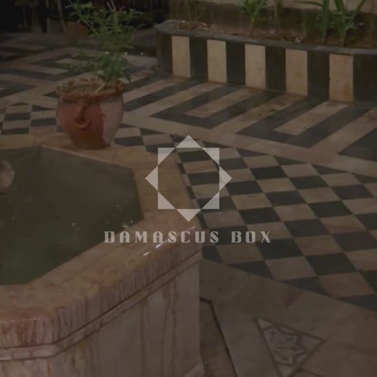 Vervaardigd uit hoogwaardig notenhout en versierd met delicate parelmoeren rozen die zachtjes oplichten bij elke beweging — vrouwelijke elegantie, gevormd door de handen van Damascus-ambachtslieden.