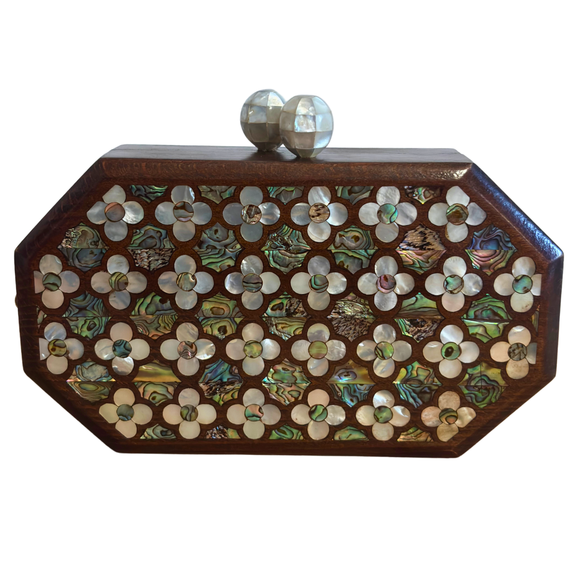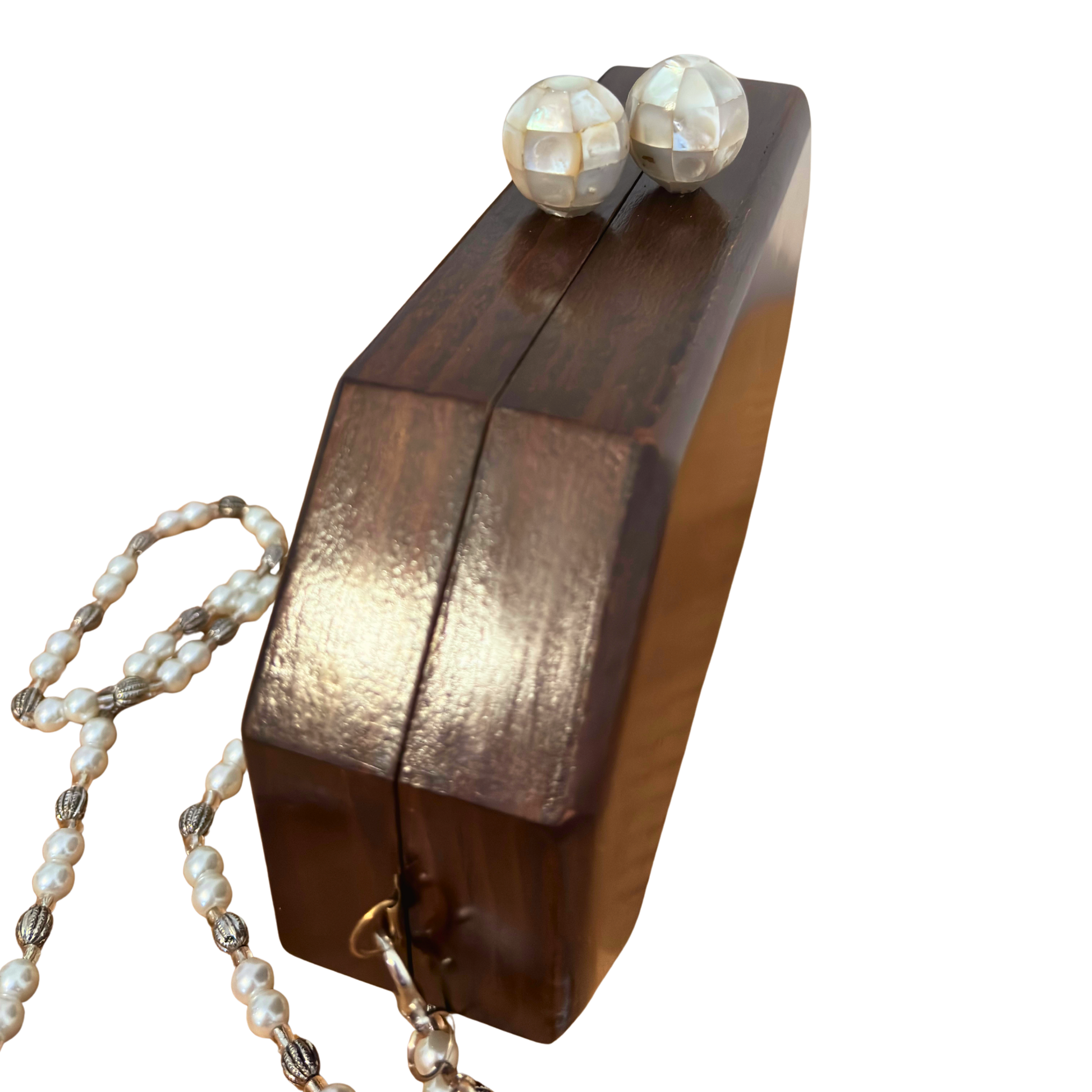 Het Gefluister van Rozen – Handgemaakte Damascener Clutch van Notenhout met Parelmoerroos en Parelketting
