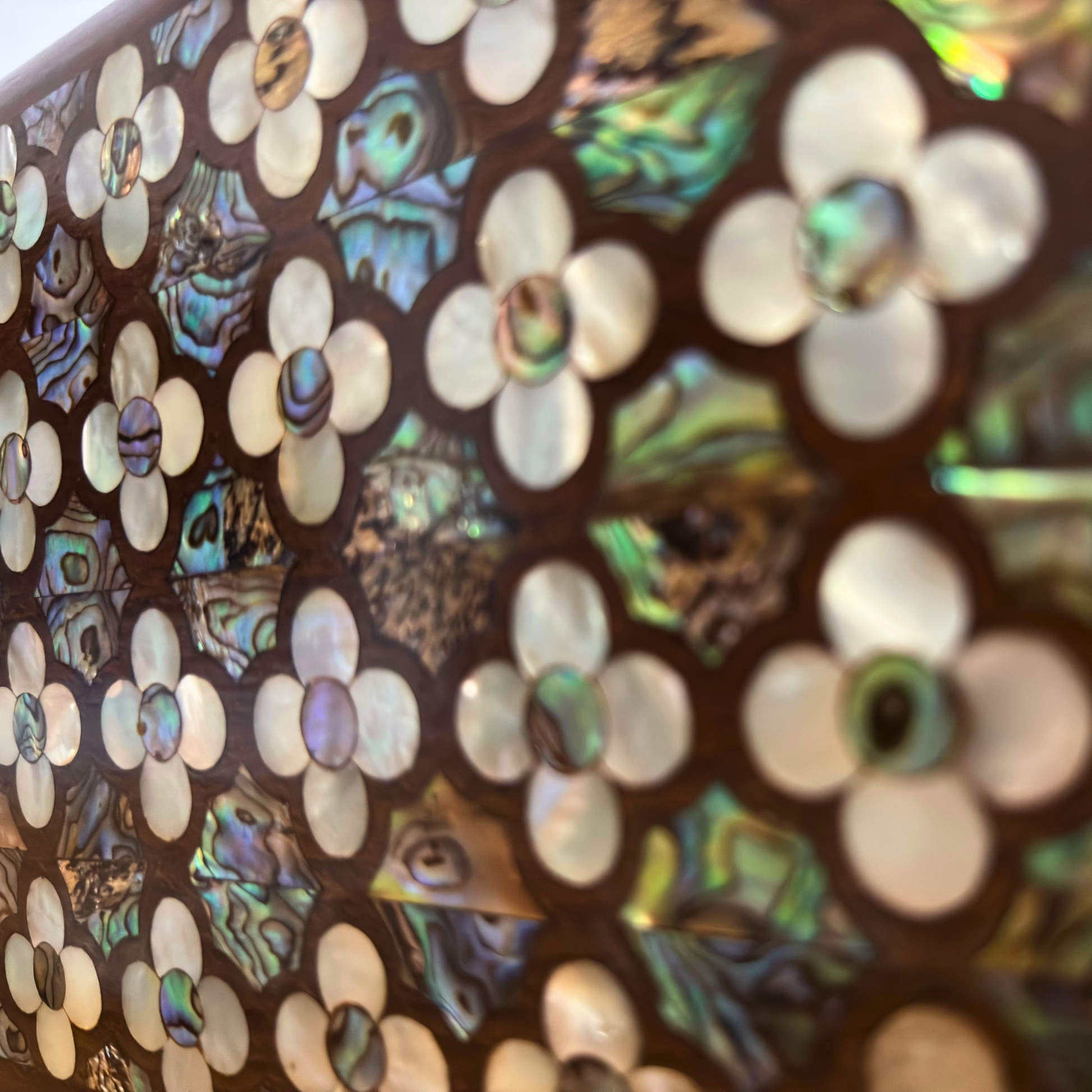 Met de hand vervaardigd uit notenhout en ingelegd met parelmoerrozen, straalt ze een zachte glans uit.
