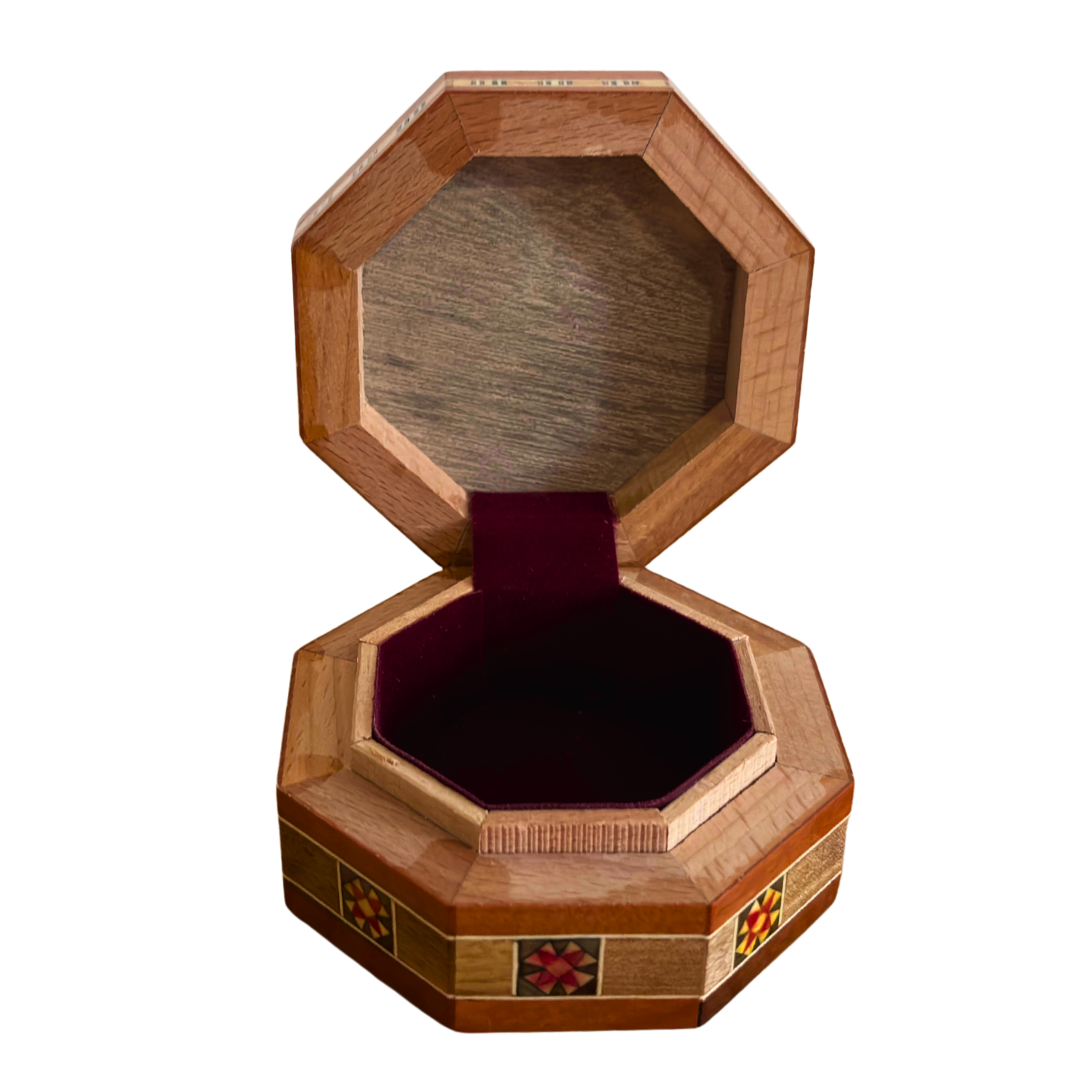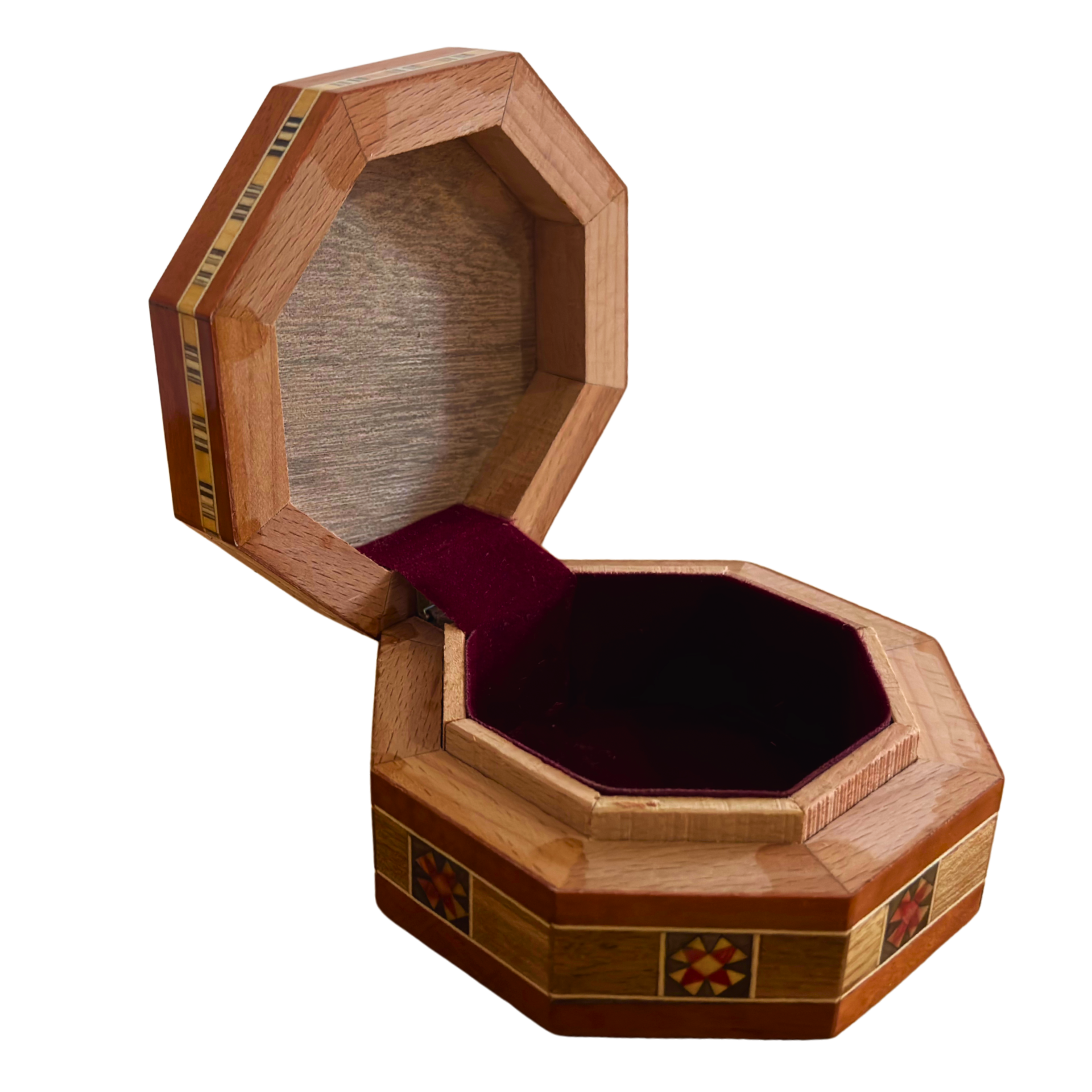 octagonal  jewelry box, Damascene mosaic keepsake, mother of pearl inlay box, walnut wood octagonal box, handcrafted small jewelry chest, Middle Eastern mosaic art, artisanal gift box, unique vintage-style box, handcrafted wood gift, elegant keepsake box, Damascus box, Syrian box, gift for her, gift for him