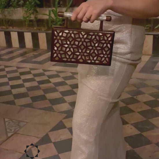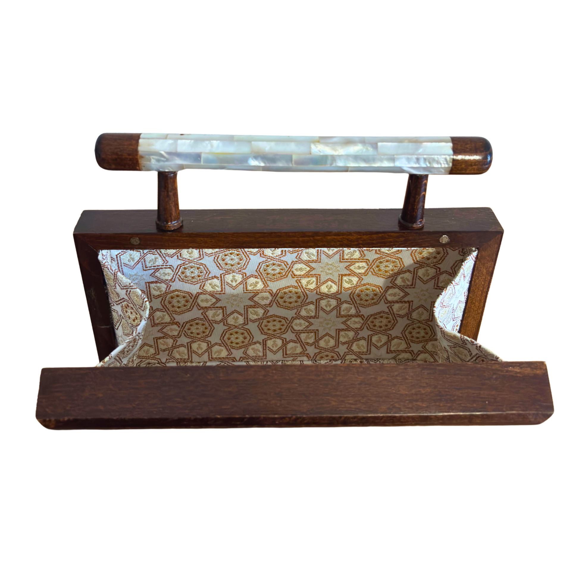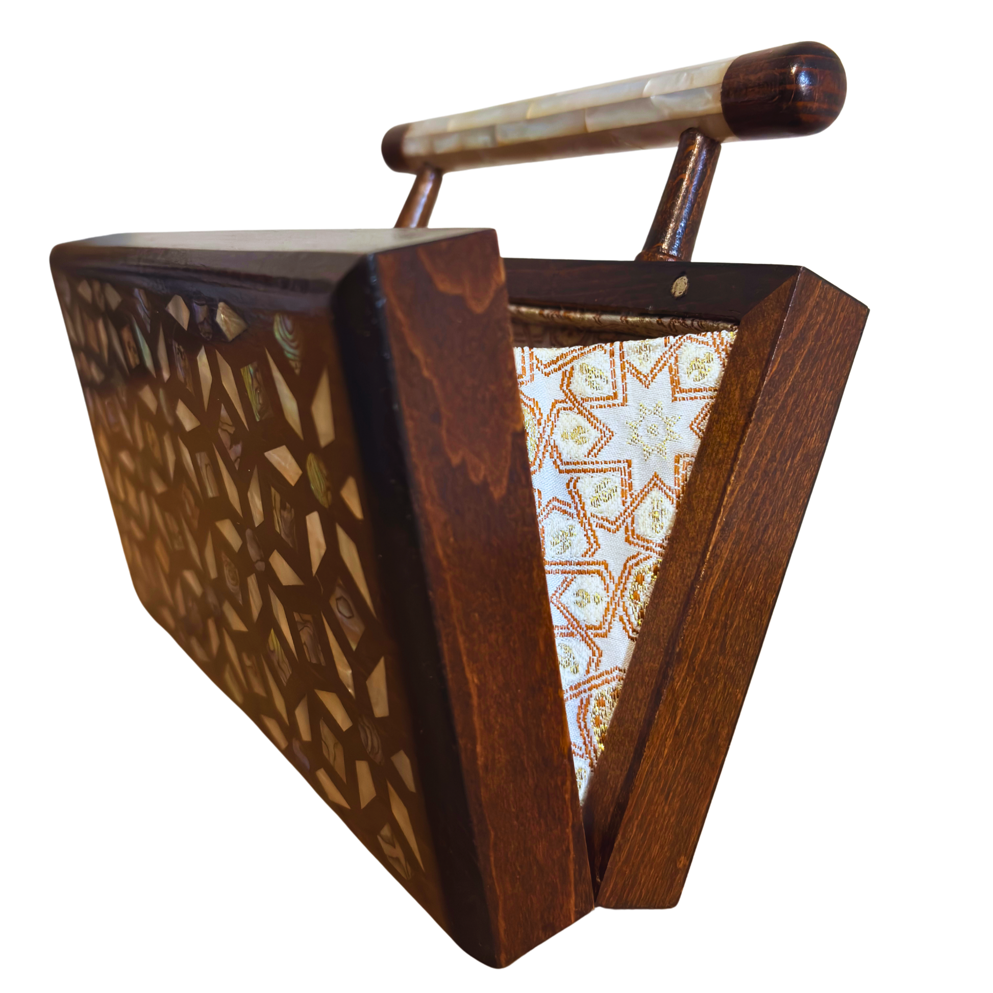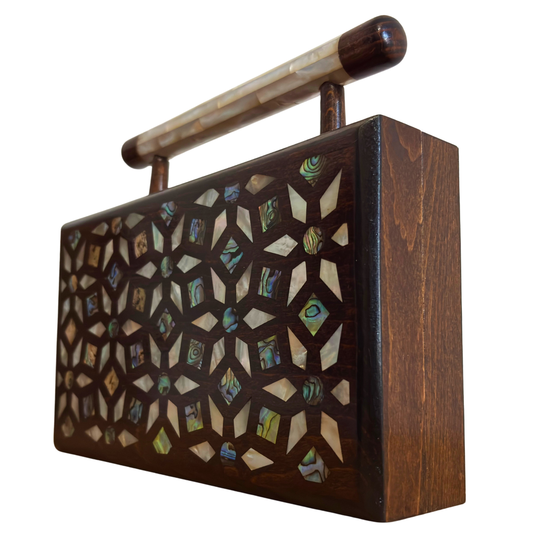 Damascene clutch, geometric pattern, botanical inlay, oriental design, mother of pearl, walnut handbag, Damascus Box