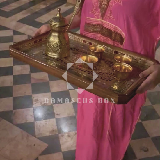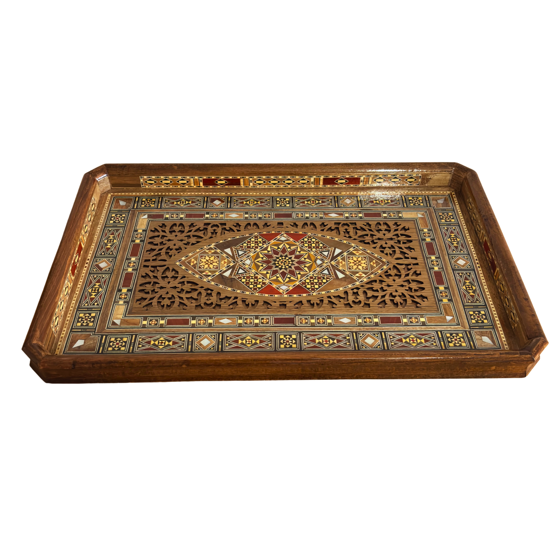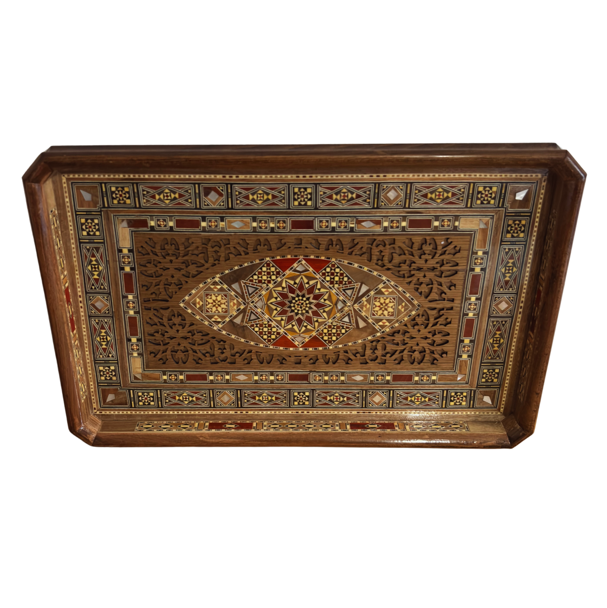 Damascene mosaic tray, mother of pearl inlay, handcrafted wood tray, oriental carved design, luxury home décor, Syrian craftsmanship, elegant mosaic art, Damascus Box