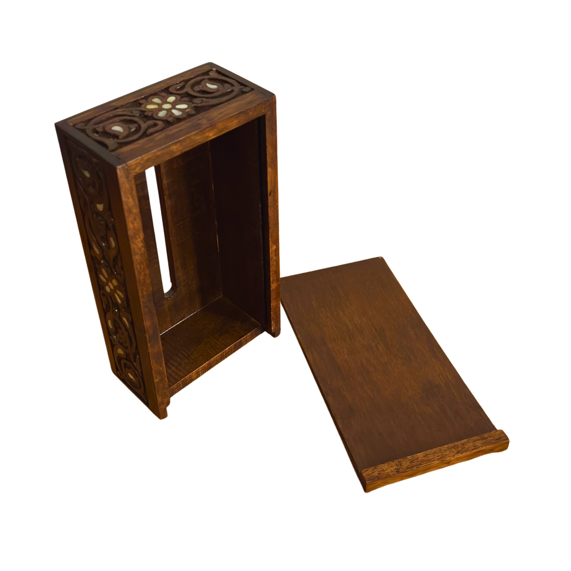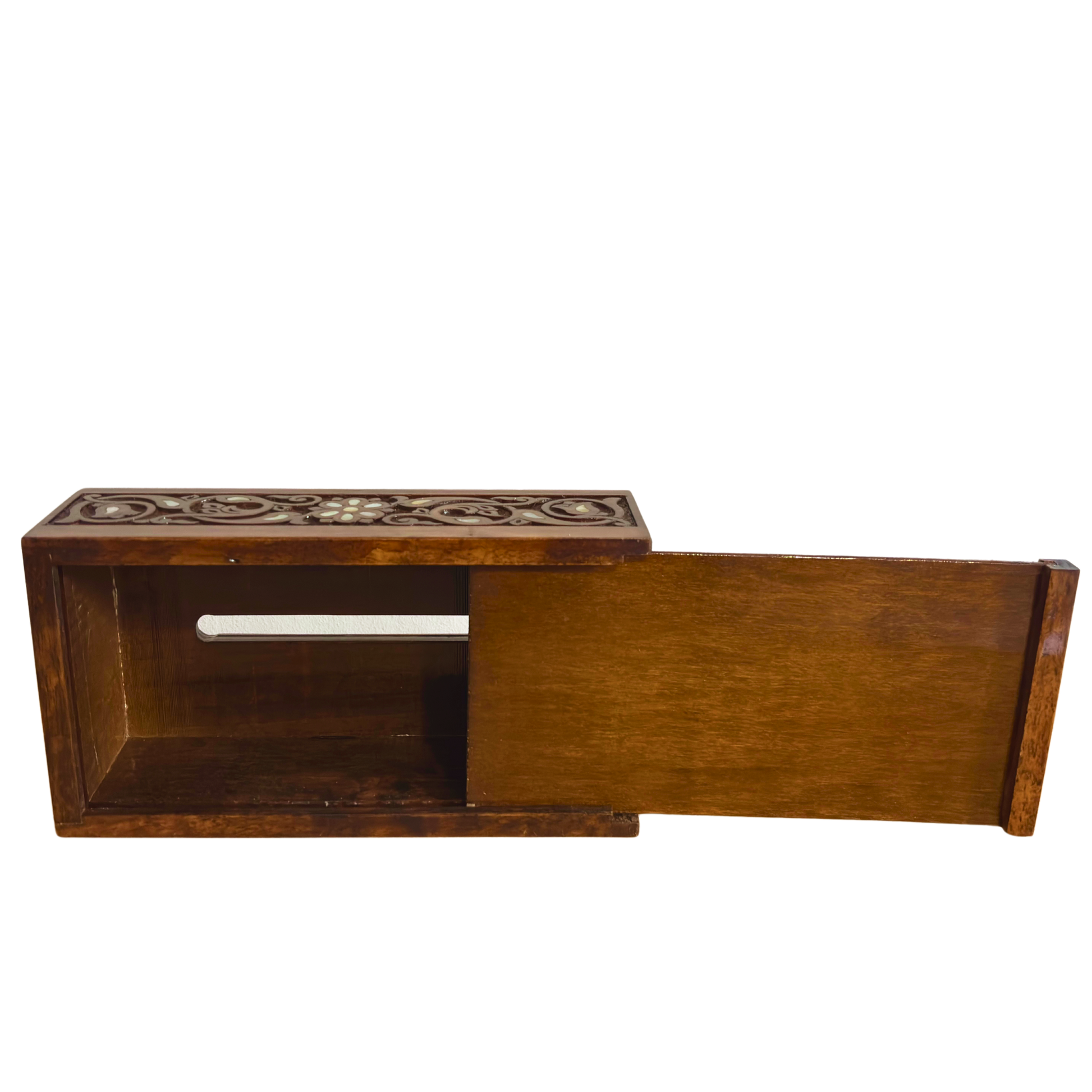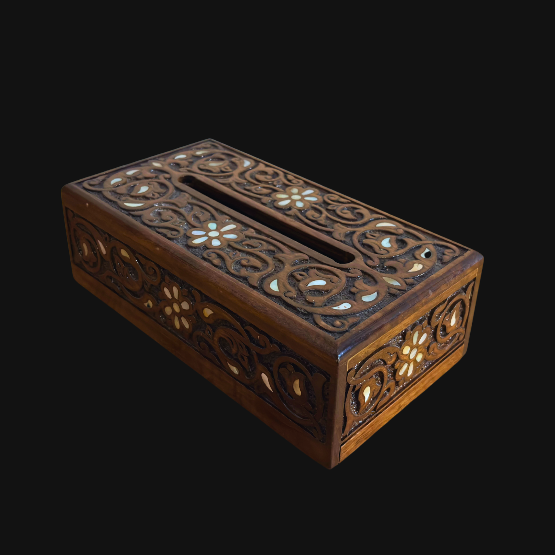 Caixa de Lenços em Madeira de Faia Talhada à Mão com Madrepérola – Acabamento em Nogueira