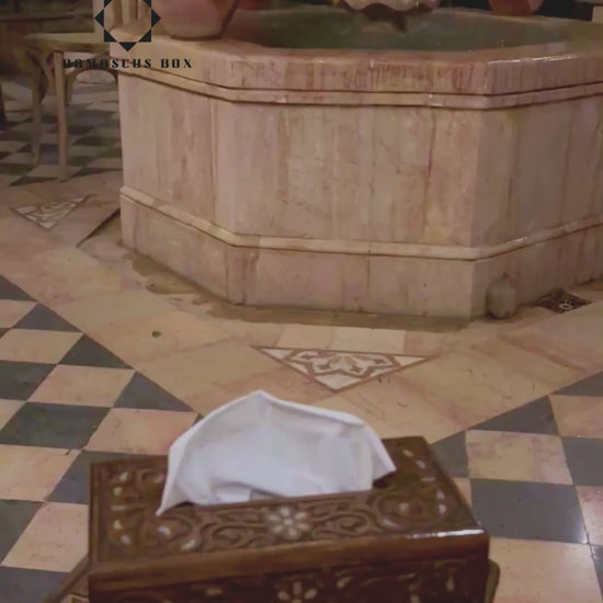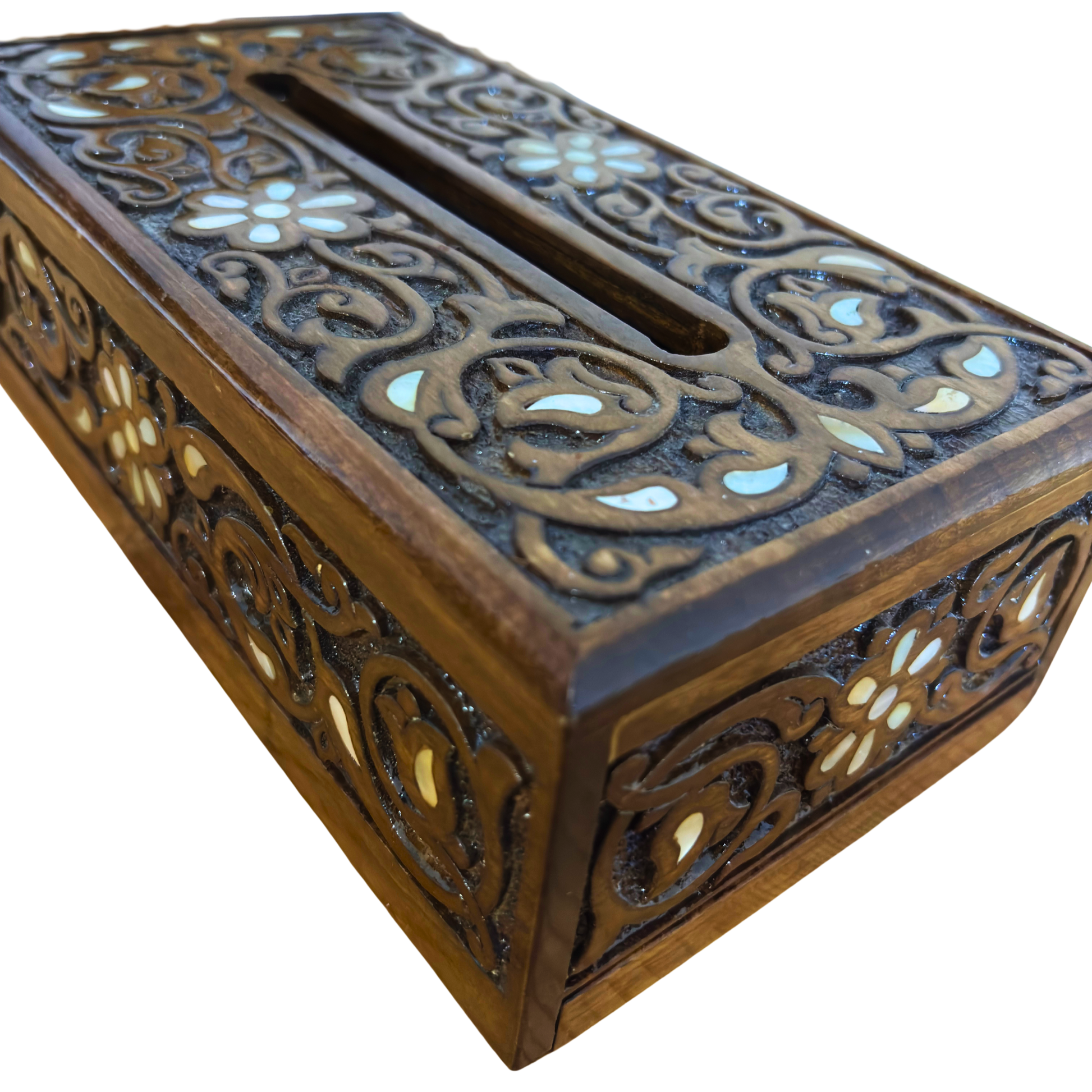 caixa de lenços artesanal, incrustações de madrepérola, arte damasquina, madeira oriental, acessório de luxo, arte em mosaico, Damascus Box