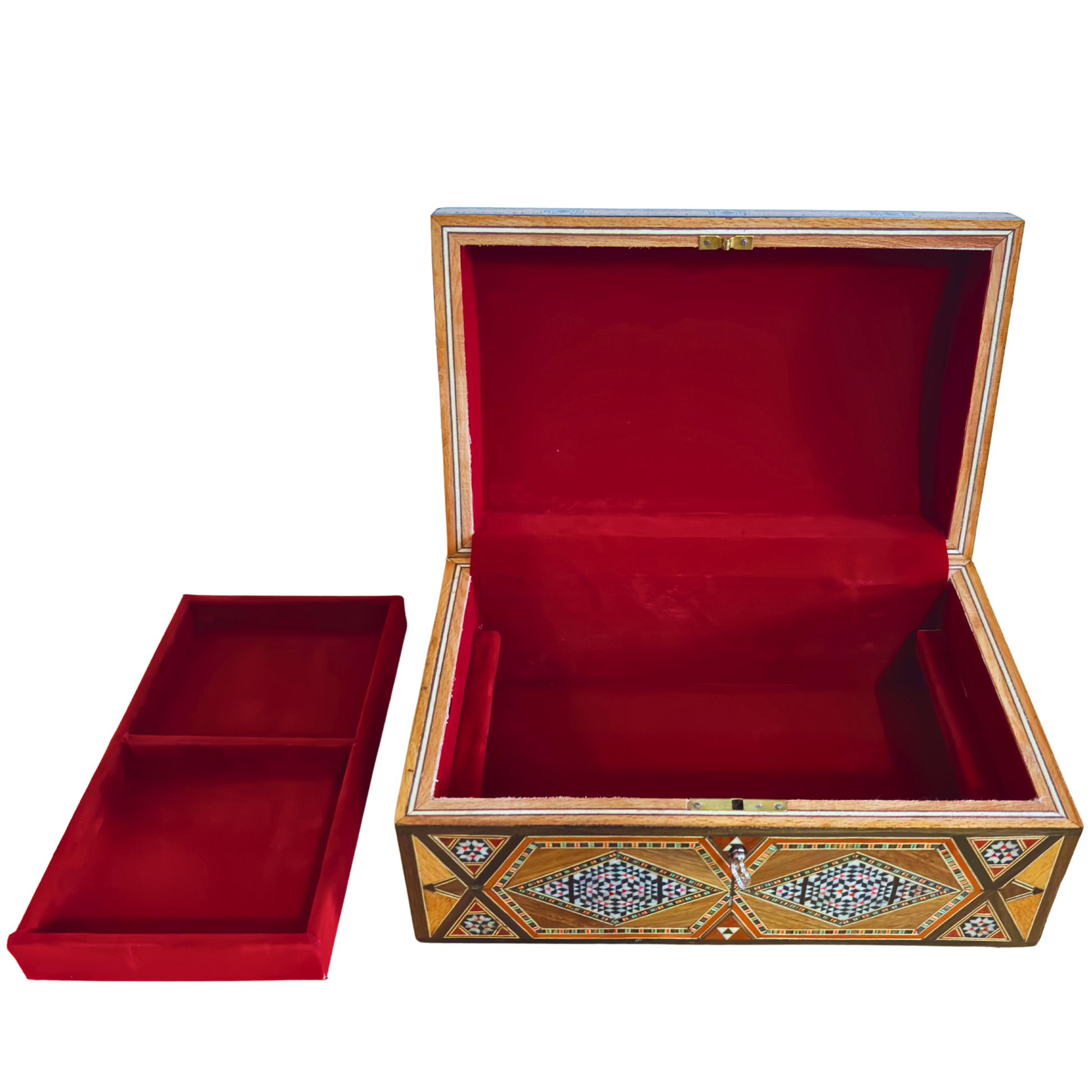 caixa de joias grande multinível, caixa damascena vintage, caixa dos anos 70 com fechadura, lembrança artesanal em madeira, caixa com incrustações de madrepérola, caixa de eucalipto, caixa vintage de pau-rosa, caixa de armazenamento vintage de luxo, presente único para ela, presente artesanal para ocasiões especiais, organizador de joias elegante, caixa de Damasco artesanal, caixa de mosaico sírio, presente vintage para ela, caixa de Damasco, presente para ele