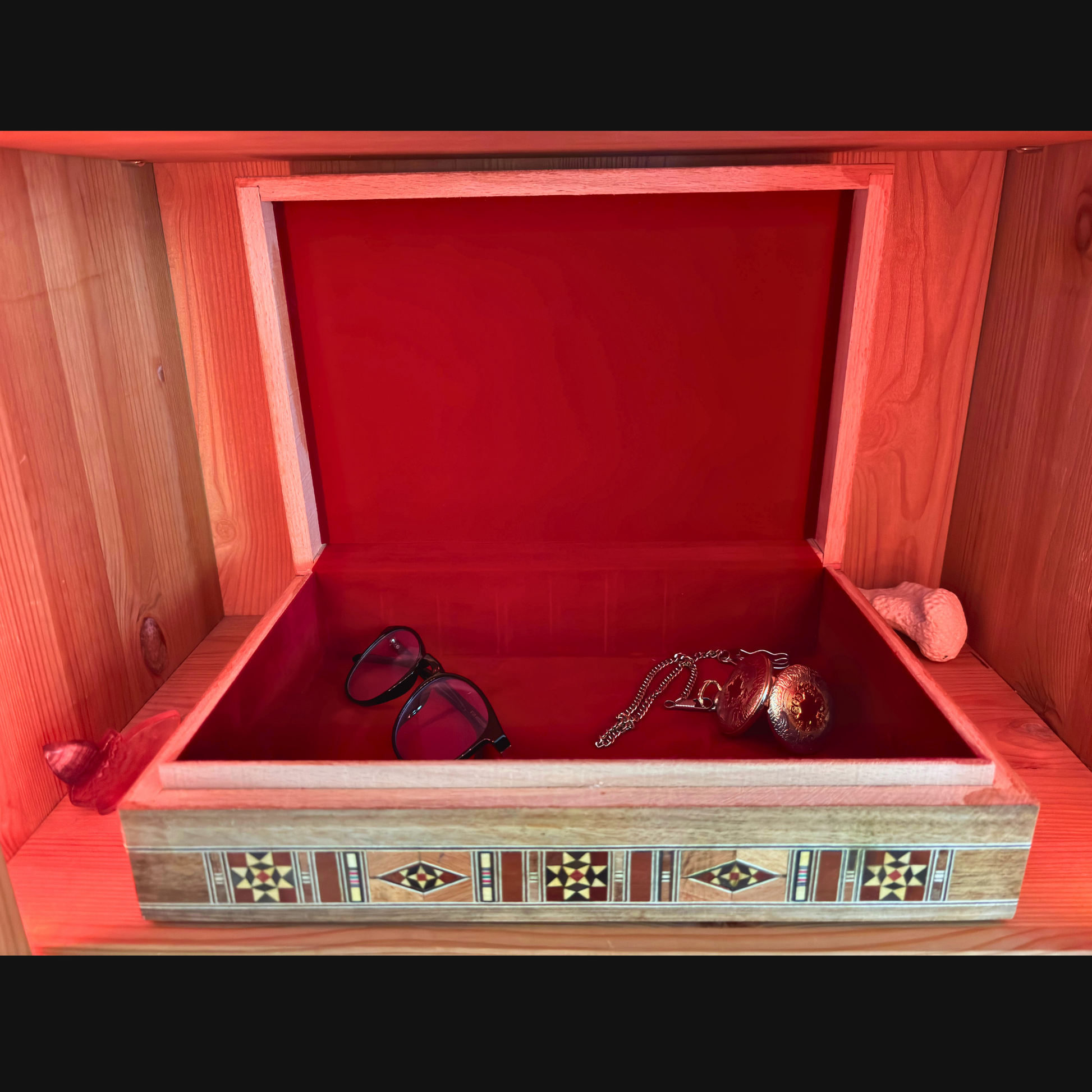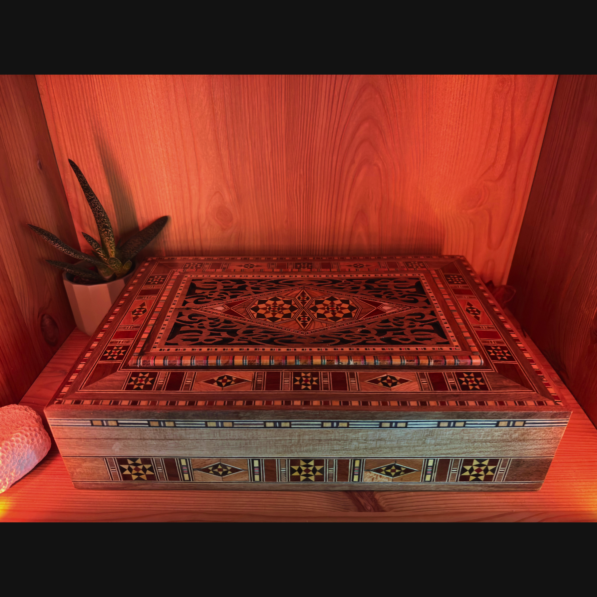 Experimente a elegância do artesanato tradicional de Damasco com esta grande caixa retangular de mosaico, meticulosamente feita à mão em madeira de faia premium. Projetada para quem aprecia arte refinada e design atemporal, esta caixa é perfeita para armazenar com segurança joias, relógios, charutos, lembranças delicadas ou objetos preciosos.